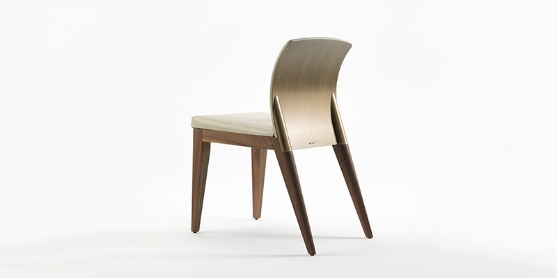 Dining chair and armchair made with wooden curved panel covered with an upholstered pillow applied on the seating and on the back