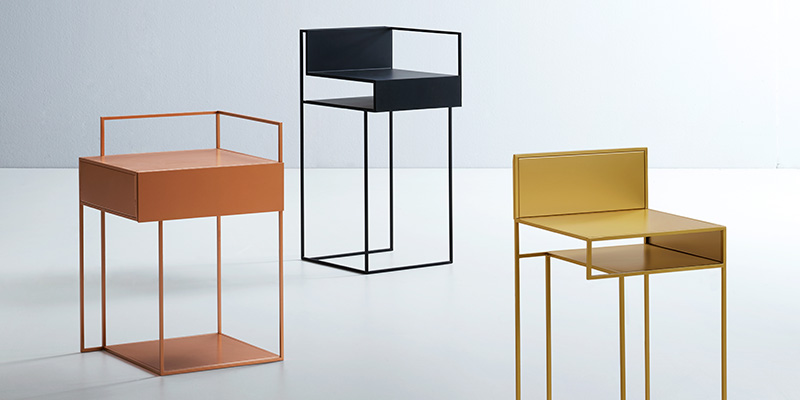 Night table with a suspended shelf framed in glass, and modular drawer on wheels